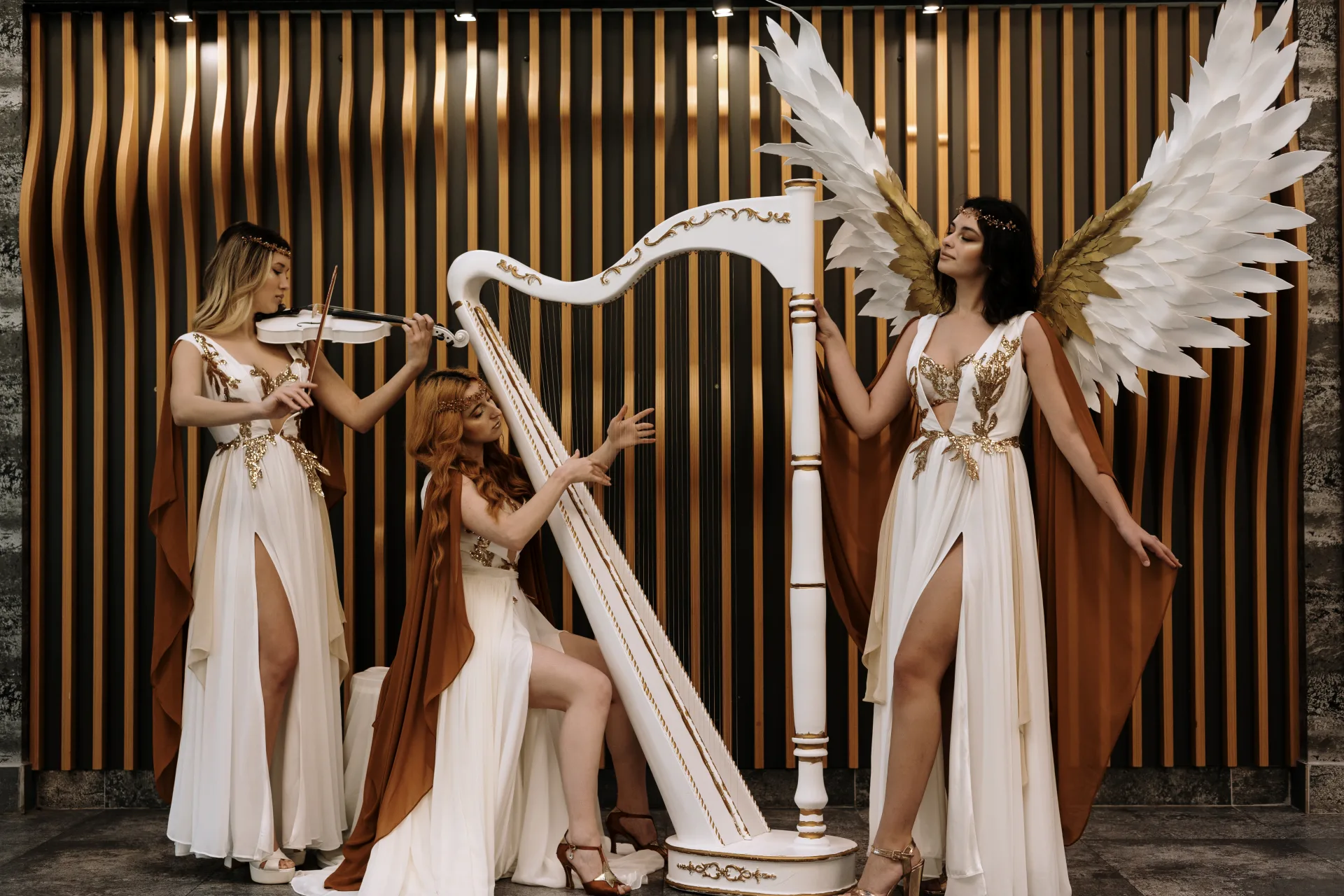 3 performansçı: biri arpta, diğerleri keman.