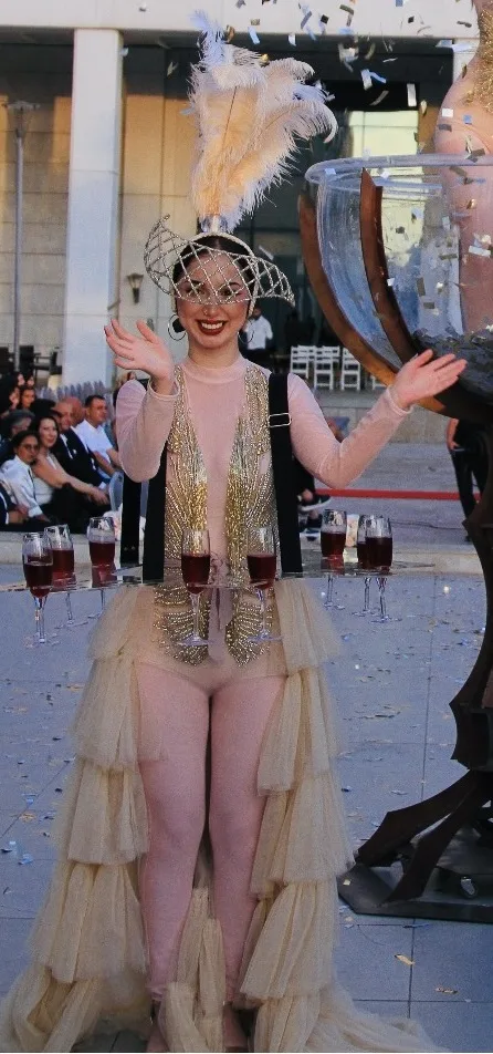 İki performansçı, şeffaf ve yıldız görünümlü pleksi etek üzerinde içecek sunumu yapar.