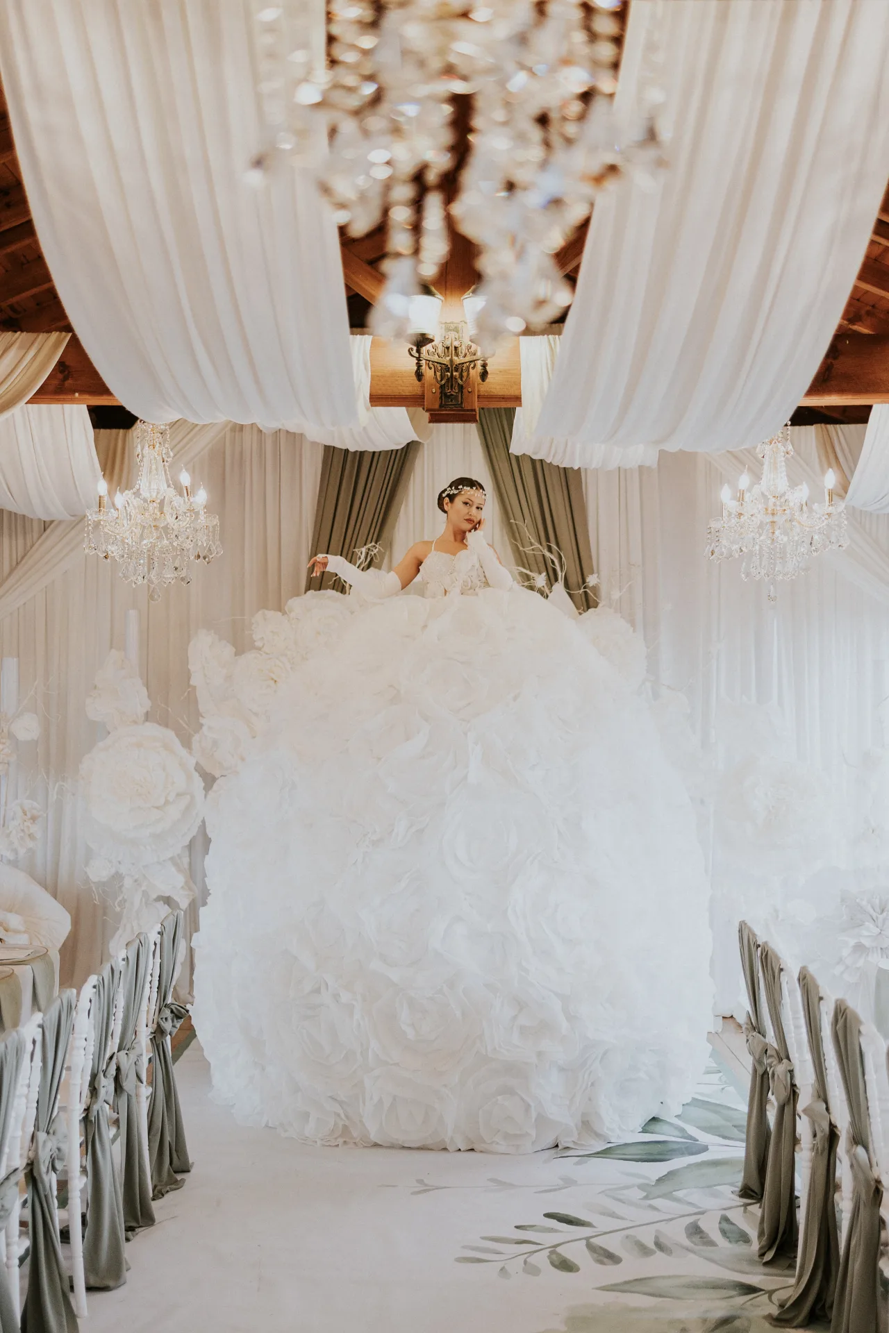 Büyük balon etek, etek üzerinde beyaz gül görseli içerir