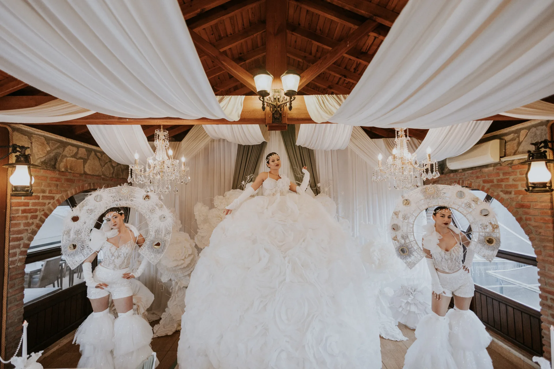 Büyük balon etek içinde performansçı sanatını sergiler.
